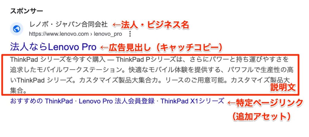 例えば「ノートパソコン 法人 おすすめ」と検索すると、以下のように検索結果の上位にリスティング広告が表示されます。