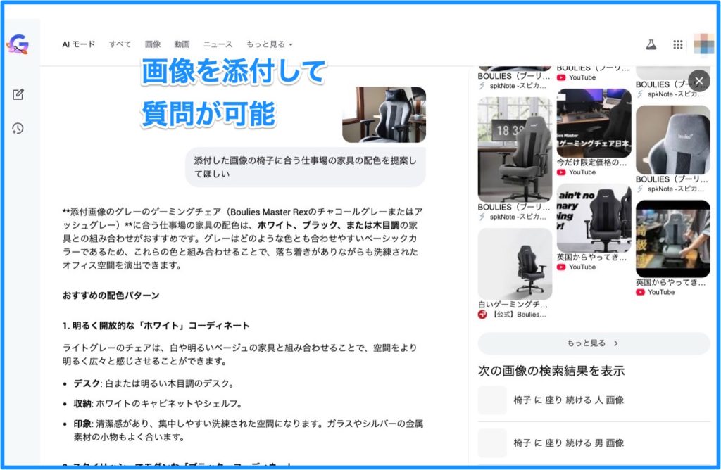ビジュアルや画像にかかわる検索はユーザーの感性やインスピレーションといった非構造的な要素に大きく依存するため、AIモードよりも多様な画像が一覧できて、直感的に好みのものを選べる従来の検索結果の方が利便性が高いと思われます。