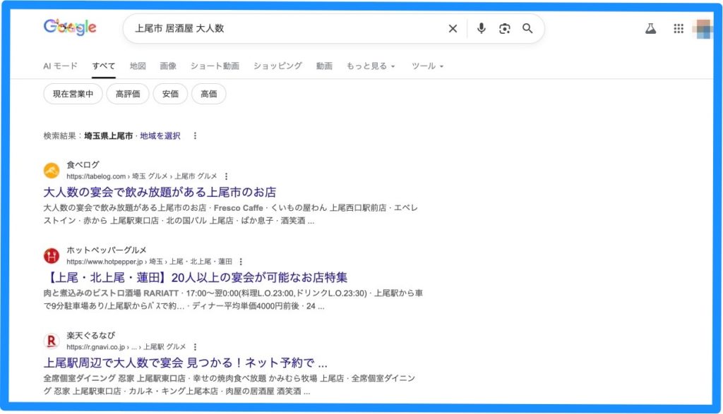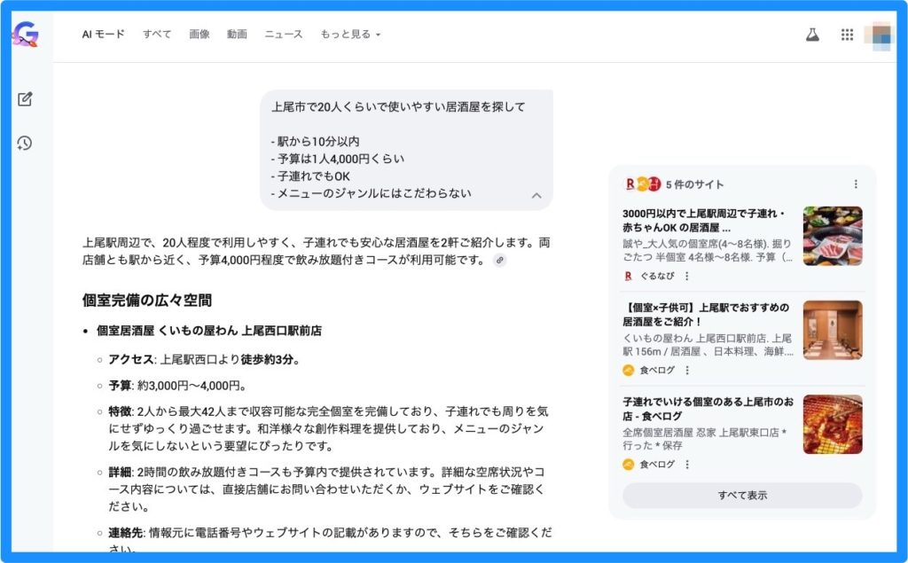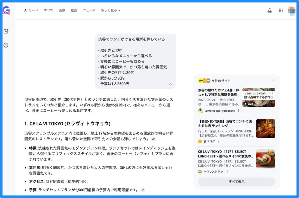 「渋谷駅から5分以内で取引先とランチができるお店」のような質問は、AIがGoogleビジネスプロフィールなどに登録された店舗の営業時間や場所など、構造化されたデータを参照しやすいため、相性が良い