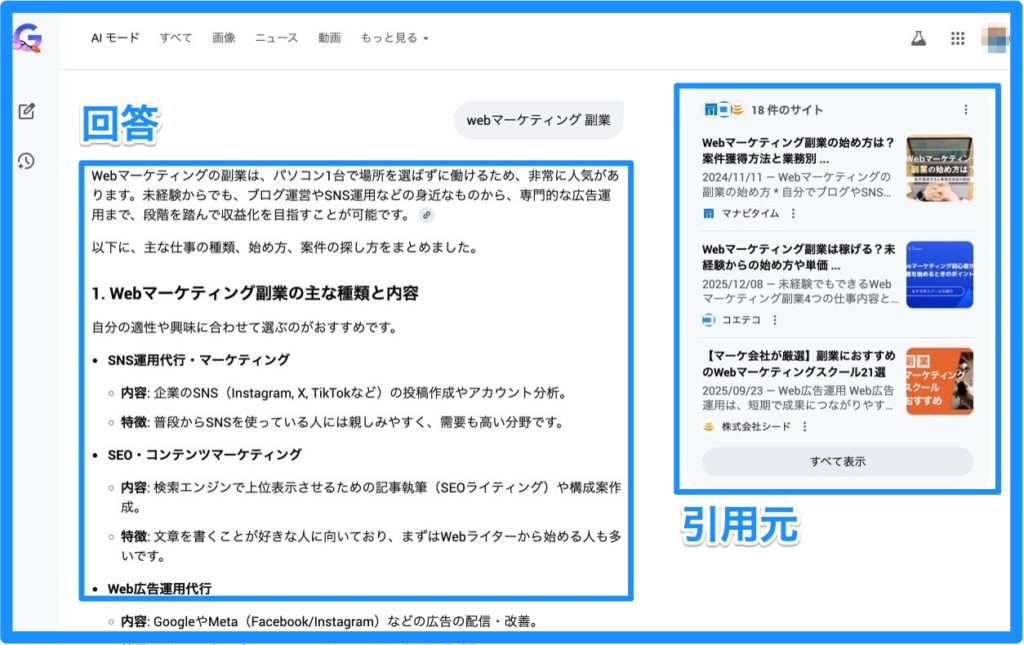 AIモードの画面では、AIが生成した回答がメインに表示されます。そして、その回答の右や下にAIが情報を生成する際に参考にした情報の引用元(ソース)へのリンクが複数表示されます。