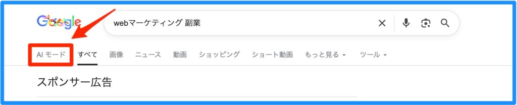 使い方はとてもシンプルです。Googleの検索結果画面に従来からあった「すべて」「画像」「ニュース」といったタブの横(多くの場合、左端)に「AIモード」という専用のタブが新設されています。