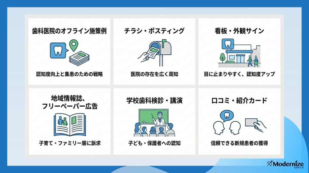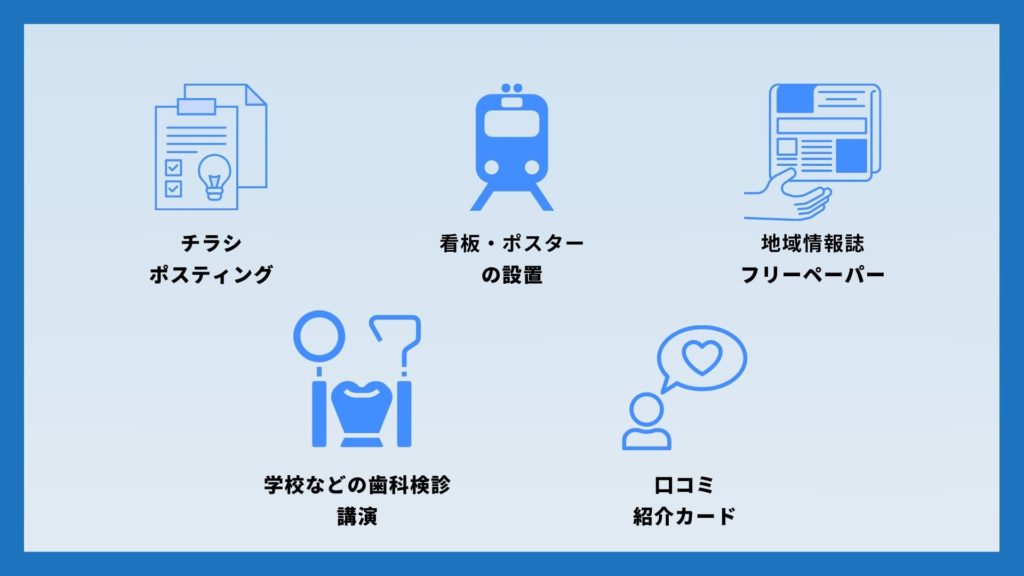 ローカルビジネスである歯科医院の集客では、オンライン施策と同じくらいオフライン施策も重要です。オフラインで患者と直接接点を持つことで、安心感や信頼性を高められます。