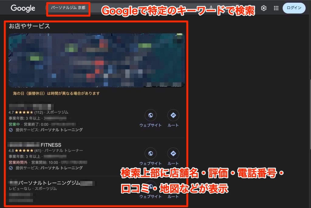 特にパーソナルジムのような地域密着型ビジネスにとって、「駅名+パーソナルジム」「地域名+パーソナルジム」などの検索で上位表示されることは、新規会員獲得の大きなチャンスにつながります。