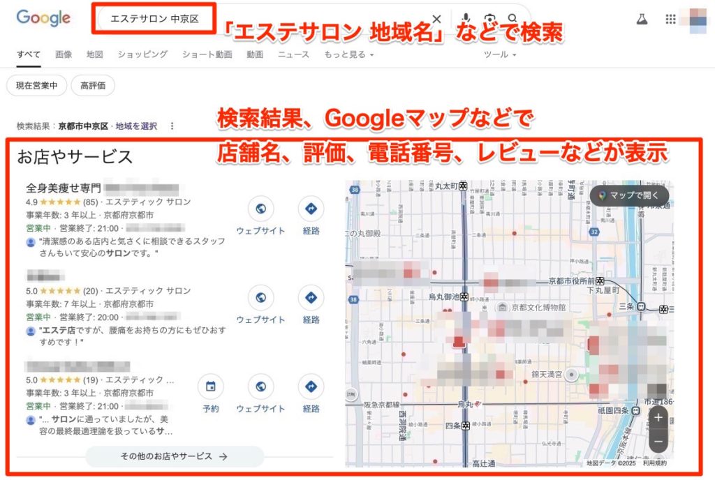 MEO(Map Engine Optimization)対策とは、Google検索や地図検索で、「地域名 エステサロン」「近くのまつエクサロン」などのキーワードで検索したときに、自分のサロンを上位に表示させるための施策です。