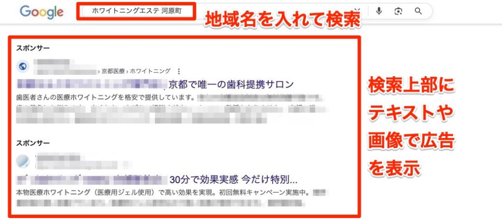 検索広告(リスティング広告)は、Googleなどの検索エンジンで「地域名 ホワイトニング」「まつエク 上手い」などの地域名やニーズで調べた人の検索結果ページに、サロンの広告を表示させるものです。