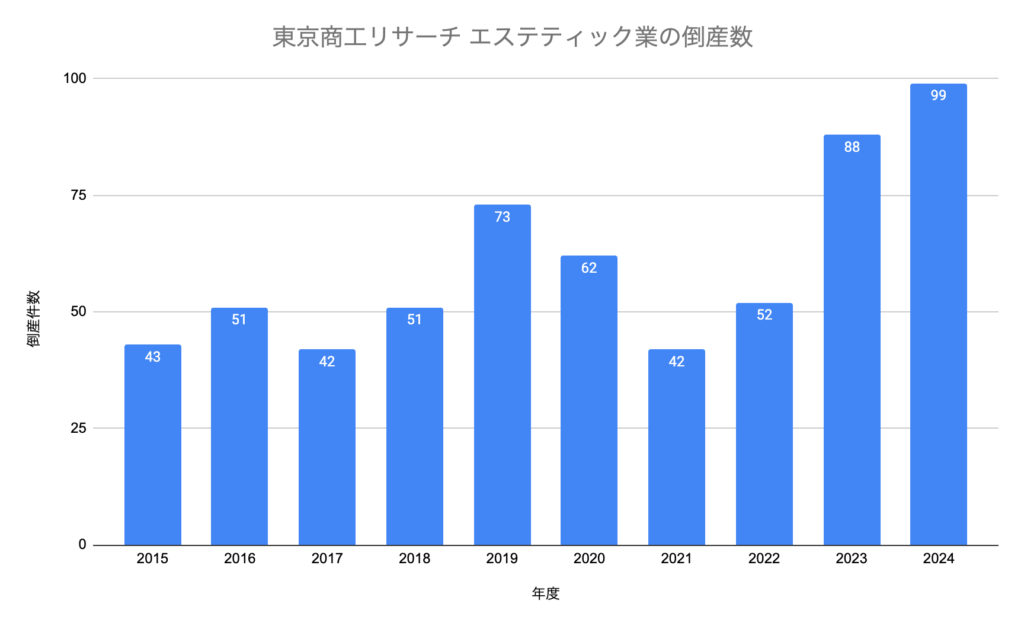 また例えば東京商工リサーチによれば、脱毛など「エステティック業」の2024年の倒産数は11月の時点で99件と、2年連続で過去最多を更新しています。