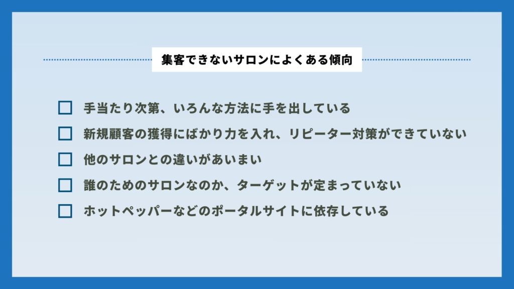 残念ながら集客ができないサロンには以下のような課題が見られる傾向にあります。