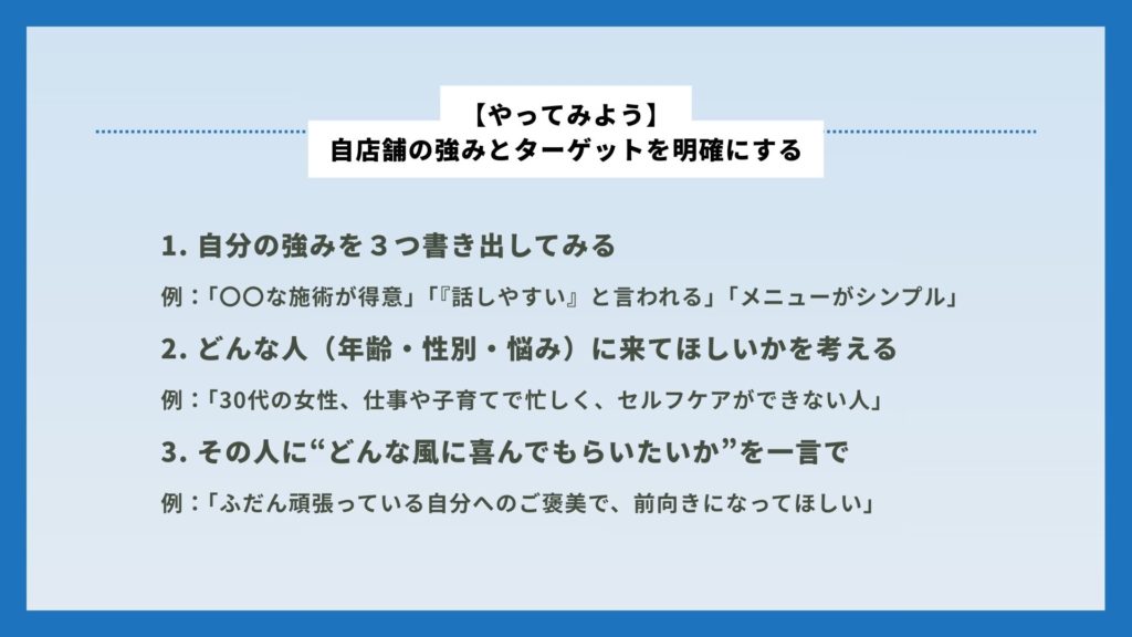 「肩こりケアが得意」「完全個室でリラックスできる」「子連れでも安心」など、自分の店舗ならではの強みをアピールすることで、同じ悩みや希望を持つ人に選ばれやすくなります。強みがはっきりすれば、その武器がどんな人の役に立つのか自ずと見えてきます。