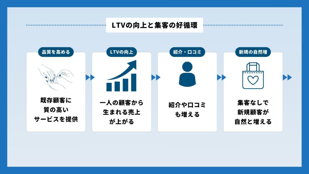 リピート顧客に利用してもらえるほど、その人一人から生まれる売上(LTV=ライフタイムバリュー)は大きくなります。一般的に顧客ロイヤルティ(信頼や愛着)が高い企業やサービスほどLTVが高くなる傾向にあります。LTVが高まれば安定した収入源になるだけでなく、紹介や口コミにもつながり、自然と新規顧客も増えるという、好循環が生まれます。