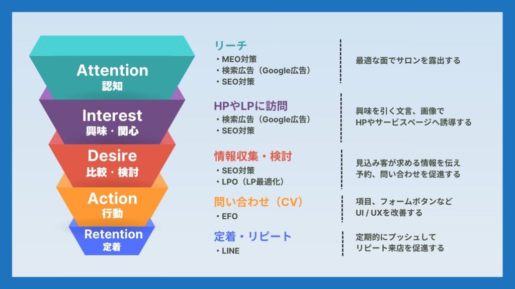 顧客や消費者が商品・サービスを初めて知り、実際に購入に至るまでの流れを段階的に分類するフレームワーク「マーケティングファネル」に、上記のプライベートサロンのオンライン集客方法を当てはめてみましょう。