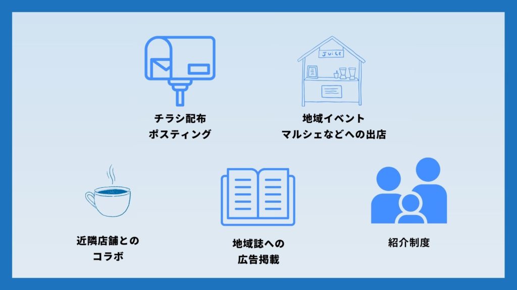 店舗周辺など地域を絞ってチラシを配布する。来店クーポンをつけても良い - 地域イベントやマルシェなどへの出店