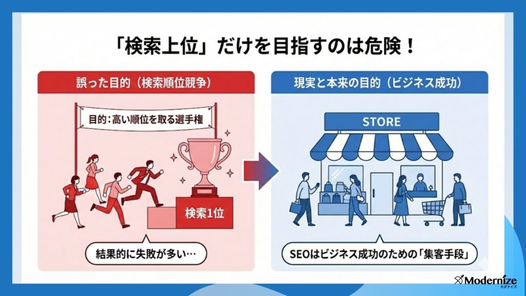 | ② 検索順位で上位を狙うことだけが目的になっている | 順位はあくまで手段。「自社ビジネスの成功(売上・リード獲得)」を最終目標に据え、順位変動に一喜一憂せず、ユーザーに選ばれる本質的な価値提供に注力する |