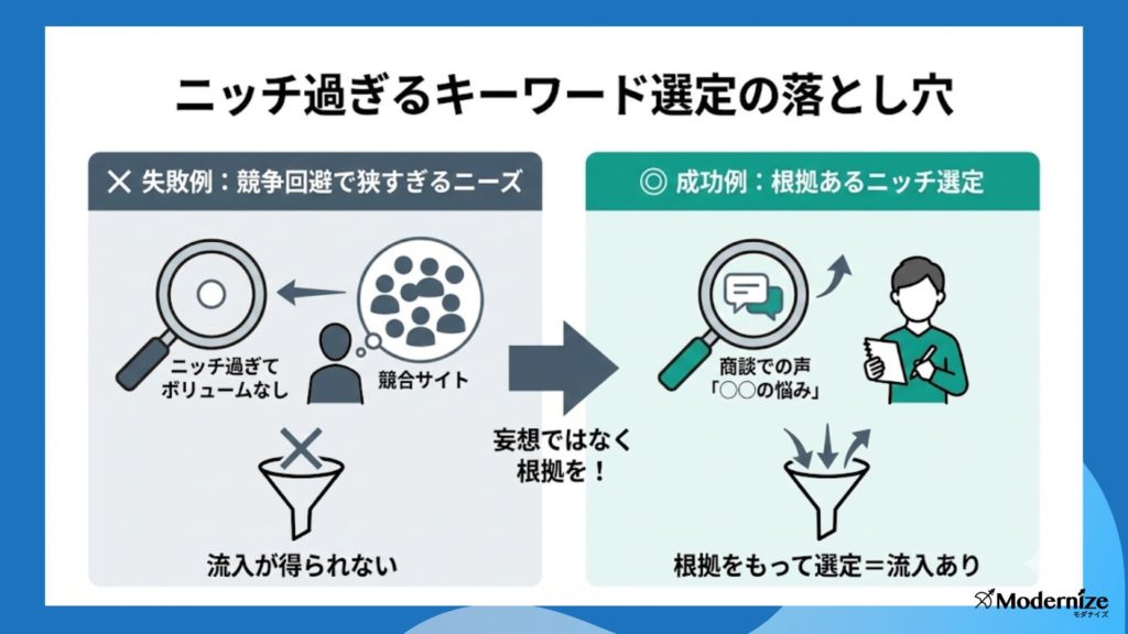 | ⑤ 検索意図がニッチ過ぎてボリュームがない | ボリュームがないことは問題ではない。想像でキーワードを選ばず、ツールでの数値確認や「実際の顧客の悩み」など根拠を持って選定する |