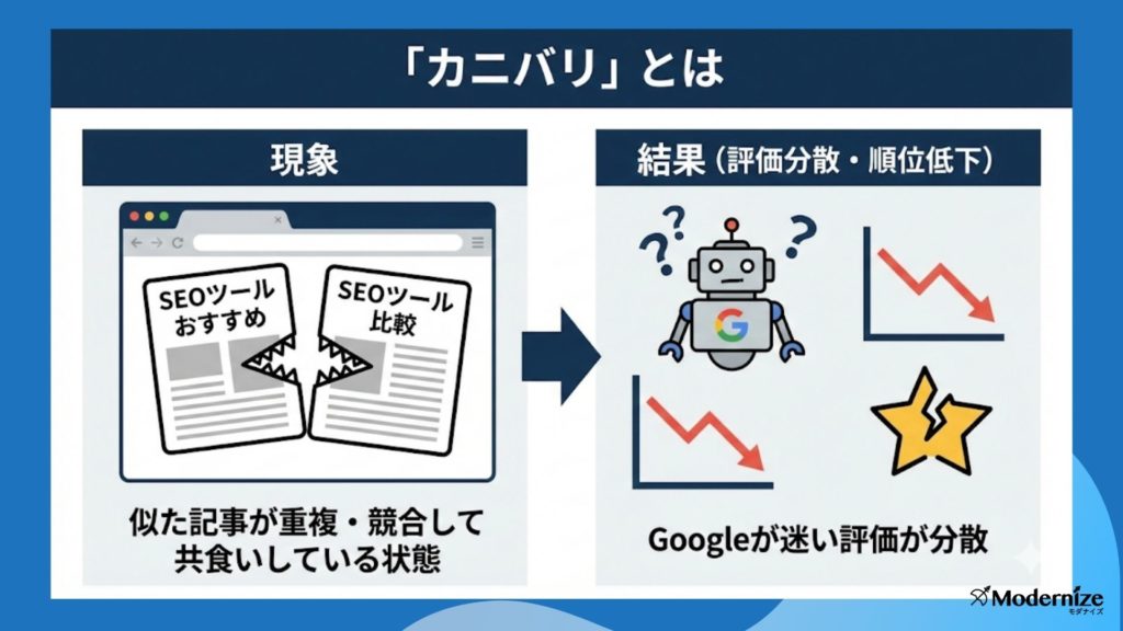 一つのサイト内に、同じキーワードや同じ検索意図(悩み)を狙った記事が複数存在している状態を「カニバリゼーション(共食い)」と言います。 例えば「SEO ツール おすすめ」という記事ページと、「SEO ツール 比較」という記事ページが別々に存在し、内容がほとんど重複しているようなケースです。