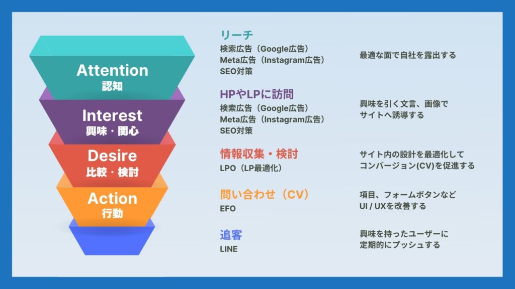 自社の課題や予算、工数や、必要な強化(リーチ、HPやLPへの誘導、申し込み など)によって、適切な施策を行うことがポイントです。